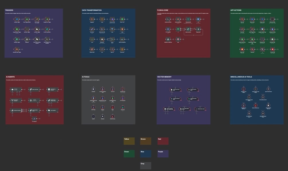 A visual map of over 100 n8n nodes. Color-coded and grouped by type, like AI Agents, Triggers, Data Tools, and more. This is not a working automation, but a reference board you can click through to learn what’s possible in n8n.