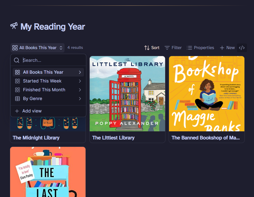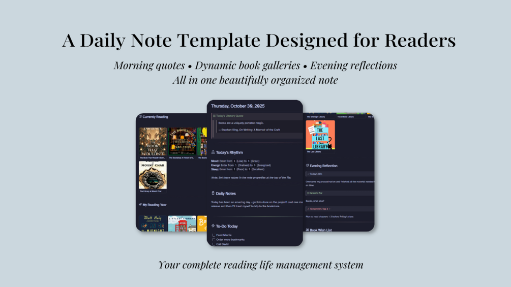 The included Reader's Day template turns every daily note into a reading dashboard. Books you start or finish today appear automatically. Your currently reading list updates in real-time. A new literary quote greets you every morning. You see "Started This Week" and "Finished This Month" views without creating a single link. This is what makes people actually use their book tracker instead of forgetting it exists in a folder somewhere.