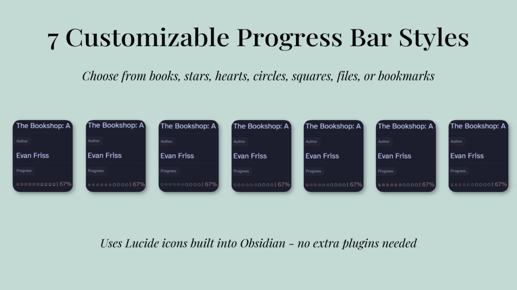→ Book Tracker Base with 7 progress bar styles (books, stars, hearts, circles, squares, files, bookmarks)