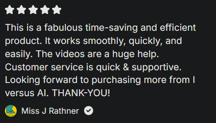 ❝ This is a fabulous time-saving and efficient product. It works smoothly, quickly, and easily. The videos are a huge help. Customer service is quick & supportive. - Miss J Rathner