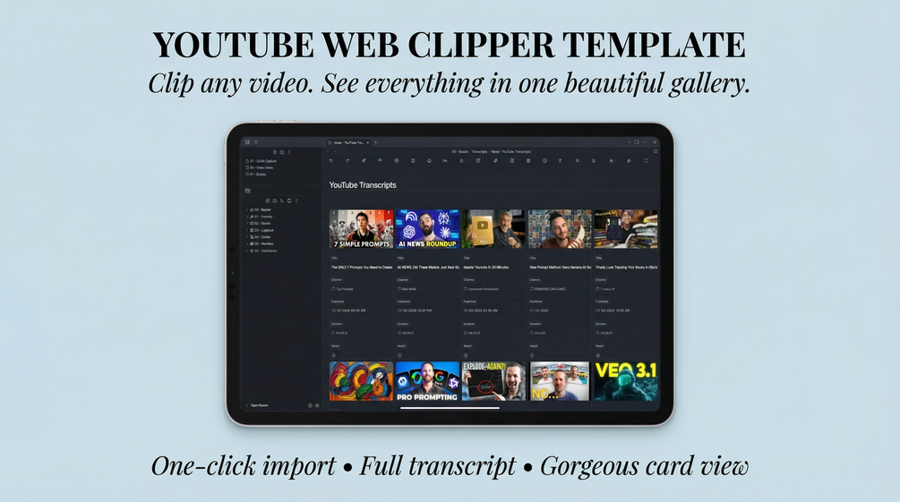 YouTube Transcript Template (JSON) • Pre-configured Base (Markdown) • 2 CSS Snippets • Master Prompt for AI Template Building • 13 Example Templates (JSON) • Complete Web Clipper Help Docs • Quick Start Guide