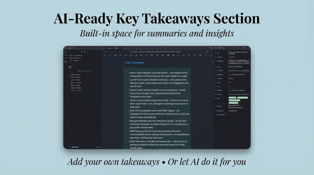 No. The template automatically captures video metadata (title, channel, thumbnail, duration, views, likes, publish date), embeds the video, and imports the full transcript. Key takeaways, tags, and aliases shown in screenshots are added separately through post-processing - not included in this template.