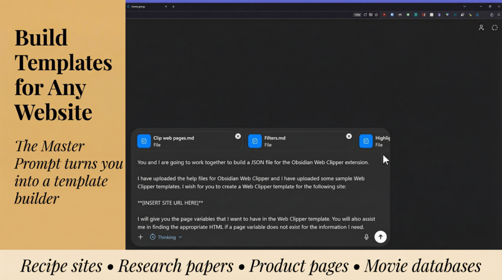 Open any webpage. Copy the HTML. Paste it into ChatGPT or Claude with the Master Prompt. Get back a working template. Recipe sites. Research papers. Product pages. Movie databases. If it has data, you can clip it.