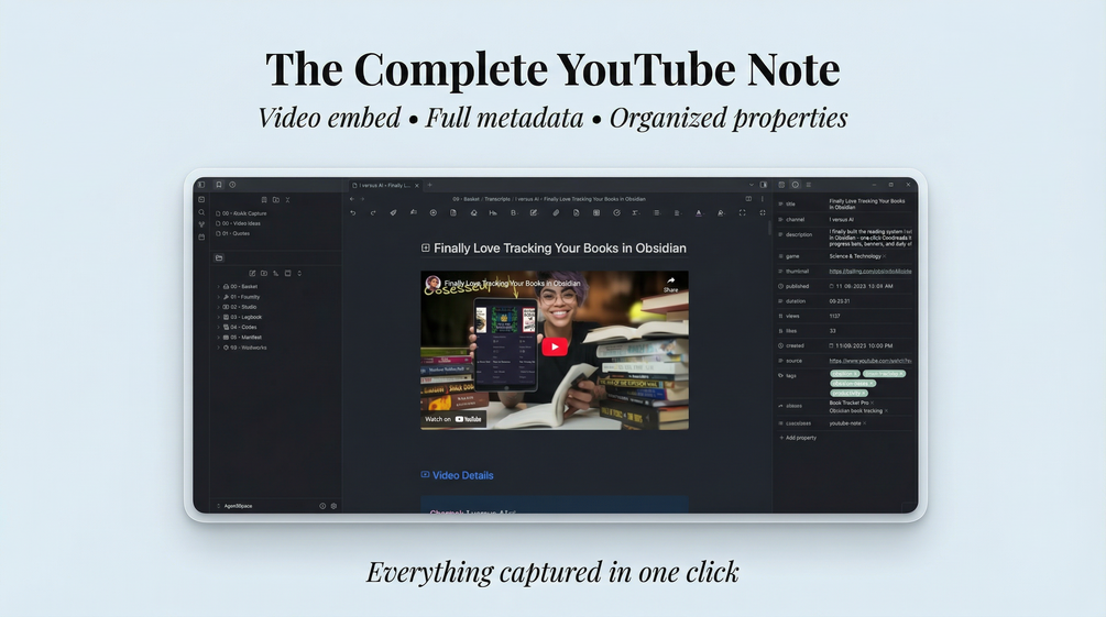 The Web Clipper template captures video metadata (title, channel, thumbnail, duration, views, likes, publish date), embeds the video, and imports the full transcript.